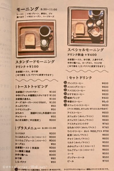 モーニングは、スタンダードモーニングとスペシャルモーニングがあります。自分はスタンダードモーニングで、トーストに何かをトッピングして、ゆで卵をバナナに変更するのが好きです。